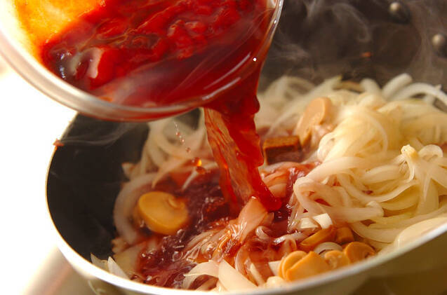 残りのバターを加え、玉ネギがしんなりするまで炒める。さらに水煮マッシュルームを加えて炒め合わせ、<調味料>の材料を加える。