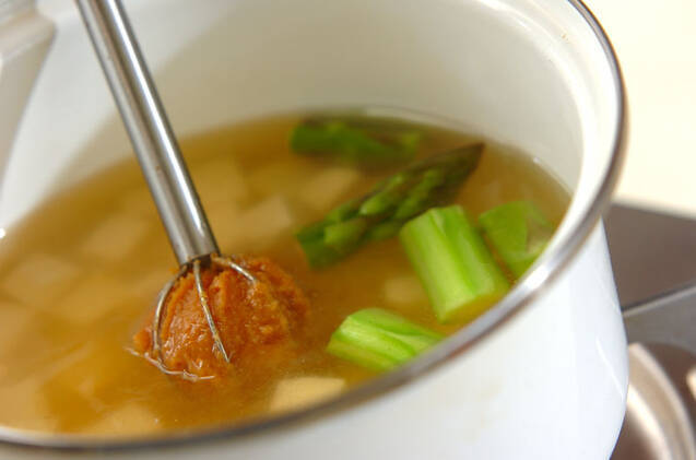 鍋にだし汁を入れて中火にかけ、煮たってきたら豆腐、グリーンアスパラを入れる。豆腐が温まったら合わせみそを溶き入れ、ワカメを加えてひと混ぜし、器に注ぎ分ける。