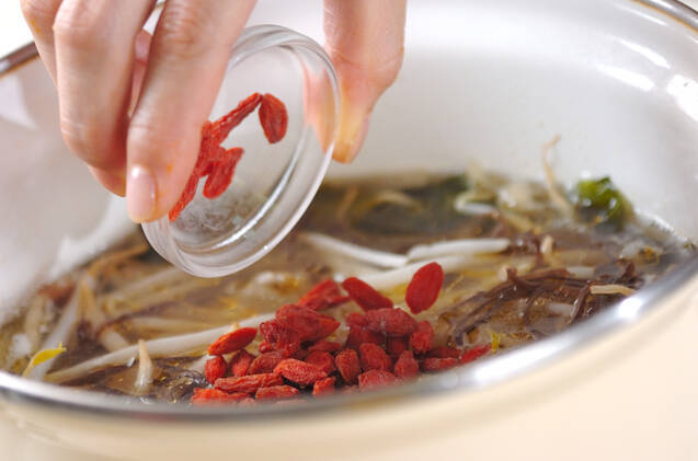 煮立ったらモヤシ、キクラゲ、クコの実を加えて煮立つ直前火を止め、器によそう。