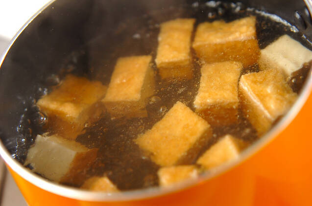 鍋に<スープ>の材料と厚揚げを入れて強火にかけ、煮たったら中火で3~4分煮る。