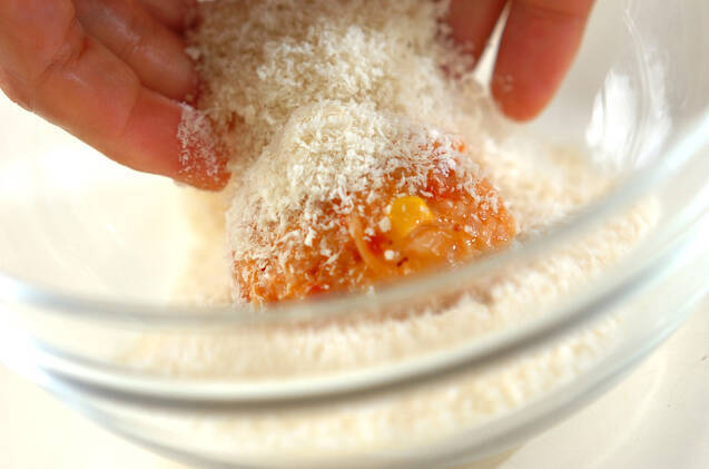 <衣>の小麦粉、溶き卵、パン粉を順番につけ、180℃に予熱しておいた揚げ油でキツネ色になるまで揚げる。器に盛り、ドライパセリを振る。