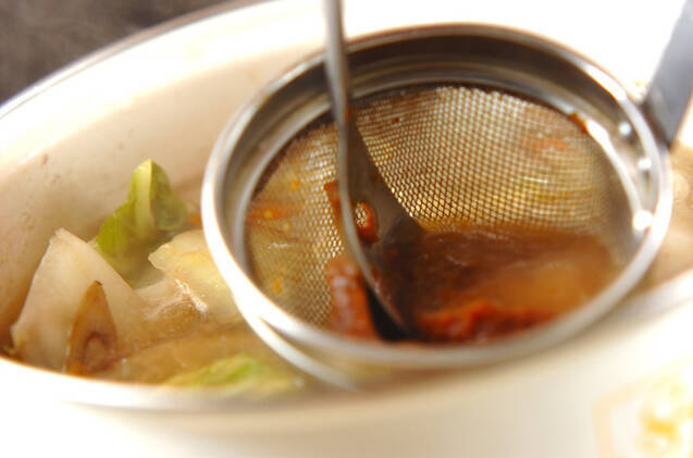煮たってきたらアクを取って10~12分煮る。みそを溶き入れて煮たつ直前で火を止め、器に注ぎ分ける。刻みネギを散らし、お好みで一味唐辛子、または七味唐辛子を振る。