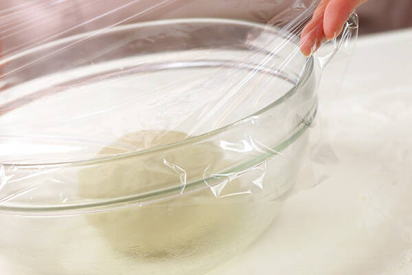 ボウルにオリーブ油を薄く塗り、生地を入れラップをかけて28℃位の温かいところへ30分置いて醗酵させる。ふくらんだ生地を打ち粉をした台に出し、手のこぶしで押さえガス抜きをし、包丁で2等分する。