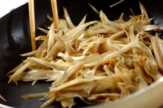 フライパンにオリーブ油を入れて中火で熱し、ゴボウをしっかり炒める。