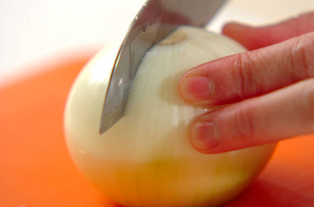玉ネギは上下を切り落として皮をむき、上下に十字に切り込みを入れる。サッと洗って耐熱容器に入れ、ラップをして電子レンジで5分加熱する。