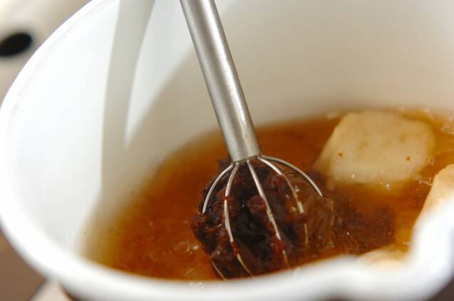 鍋にだし汁を入れて中火で熱し、煮たったら麩を加えて赤みそを溶き入れる。