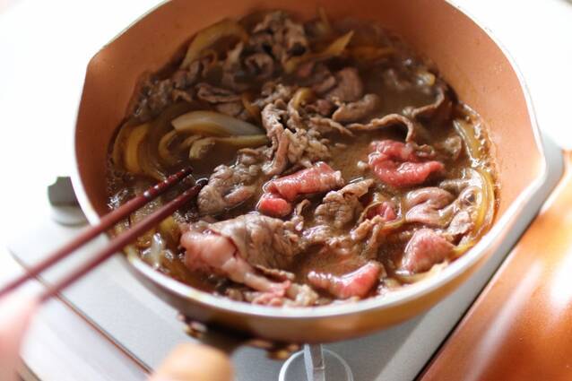 玉ネギが透き通ってきたら、牛肉を入れる。牛肉の色が変わり、汁気が半分ほどになるまで4~5分煮る。
