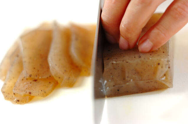 板コンニャクはたっぷりの熱湯で1~2分ゆでてザルに上げ、粗熱が取れたら横半分に切って縦薄切りにする。