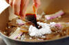 (1)のフライパンに残りのサラダ油を熱し、ニンニク、ショウガを炒め、香りがたってきたら板コンニャク、カマボコを加えて炒め合わせ、<調味料>の材料を加える。