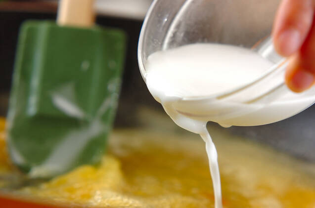 <オレンジソース>を作る。(1)のフライパンに<オレンジソース>の材料を入れて、中火にかける。煮立ったら<水溶きコーンスターチ>を混ぜながら加え、トロミがついたら火を止める。