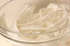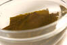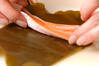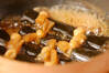 竹串がスッと刺さる位まで柔らかくなったら、砂糖大1を加え5~6分煮て、砂糖大1、しょうゆ大1を加え5~6分煮る。さらに砂糖大1、しょうゆ大1を加えて5~6分煮る。最後にみりん大2、しょうゆ大1を加え5~6分煮、そのまま冷ます。