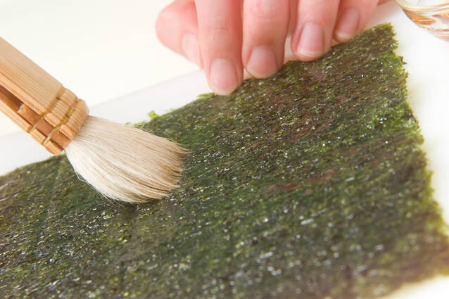 のりは片面に薄くゴマ油を塗り塩を振り掛け、ゴマ油を塗った側を合わせ軽くあぶり、あぶった面を合わせゴマ油を塗った側を軽く焦がさないように香ばしくあぶり、食べやすい大きさに折るように切る。