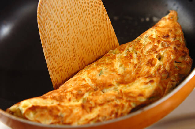 小さめのフライパンにサラダ油をひき、(1)の卵を一気に流し入れ、菜ばしで大きく円を描くように混ぜる。お好みの半熟状態で半分に折り、半月形にする。2つ作る。