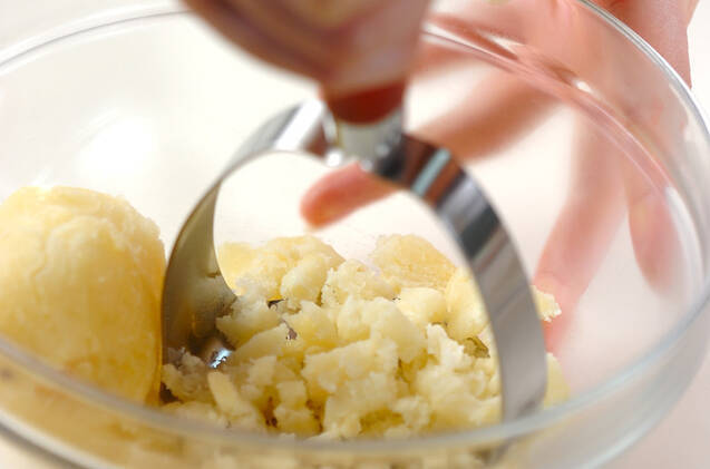 ジャガイモは皮ごときれいに水洗いし、ぬれたままラップで1個ずつ包み、電子レンジに3〜4分かけ、向きを返してさらに3〜4分加熱する。竹串がすっと刺さったらOKです。熱い間にタオルなどで包んで皮をむきマッシャー等でつぶす。600Wの電子レンジを使用しています。