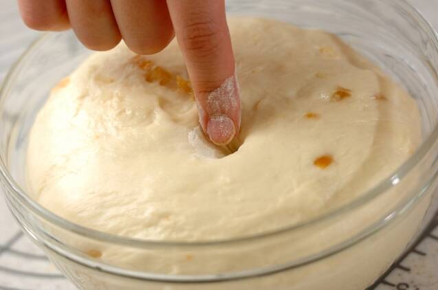 【一次発酵後】生地が2倍くらいになり、分量外の強力粉を指につけてフィンガーテストをして穴がすぐに戻ってこなかったら発酵終了。