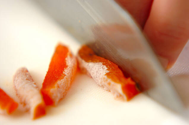 干し柿はヘタを取り、幅5mmの棒状に切る。