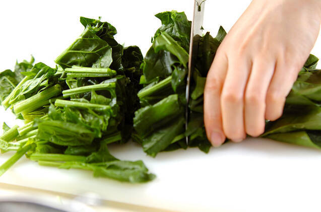 ホウレン草は根元を切り落とし、ザク切りにする。