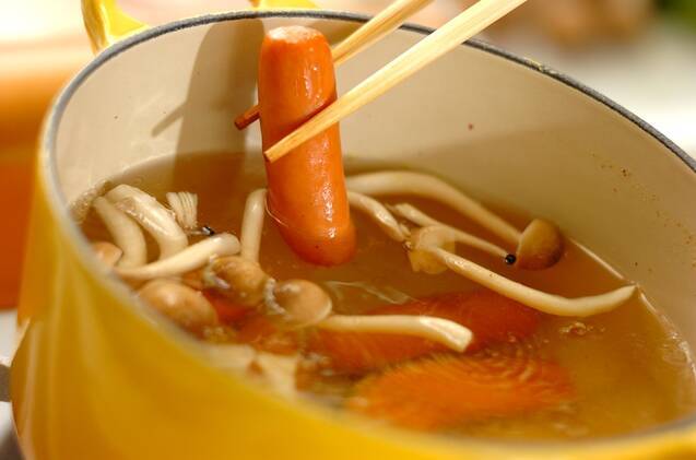 鍋に<スープ>の材料を入れ、煮たたせる。お好みの具を入れ、火が通ったら<つけダレ>をつけていただく。