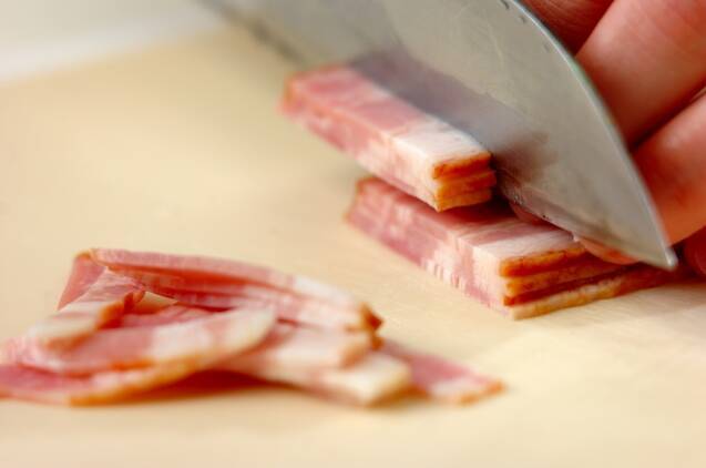 お米は炊く30分前に水洗いし、ザルに上げておく。ベーコンは短冊切りにする。水煮コーン(缶)の汁気をきっておく。