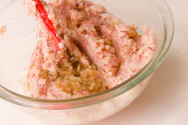 フライパンにバター10gを熱し、玉ネギがしんなりするまで炒め、白ワイン、塩、コショウを加えて味を調える。2に加えて、更に混ぜあわせる。