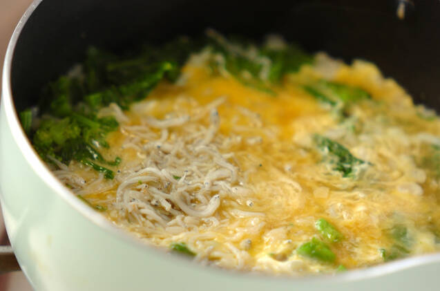 菜の花に火が通ったら、ご飯、シラス干しを加え、しょうゆで味を調える。溶き卵を加えて火を止めて蓋をし、半熟になったら器に盛る。