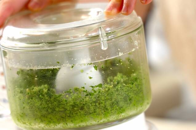 フードプロセッサーに、バジルの葉、ニンニク、松の実、粉チーズ、塩を入れ、ペースト状になるまでかくはんする。