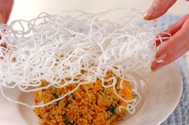 コチュジャンを加え全体にからまったら、1のご飯を加えてサッとまんべんなく炒め合わせる。器に盛り付け、白ゴマを振り掛け春雨を飾る。