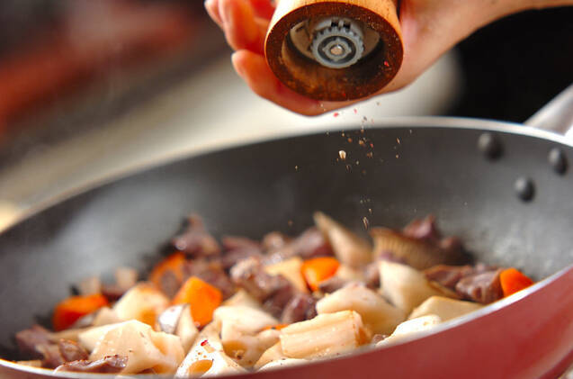 フライパンにサラダ油を入れて中火にかけ、砂肝、レンコン、ニンジン、エリンギを炒め、砂肝の切り込みが開いてきたら塩コショウを振る。