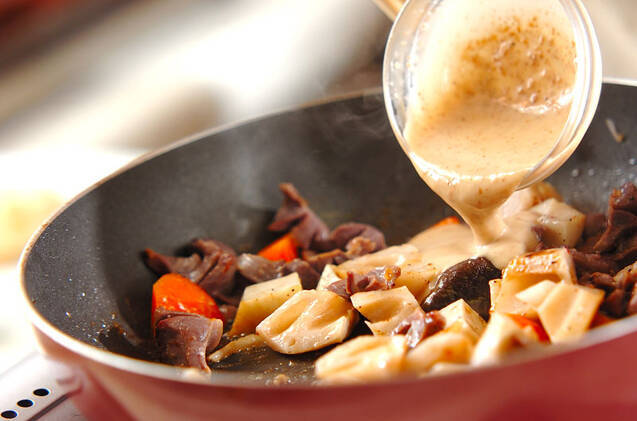 白ワインを加えてフライパンに蓋をし、蒸し焼き状態で具に火を通す。火が通ったら蓋を取って強火にし、水分を飛ばしてゴマドレッシングを加え、全体にからめて火を止める。