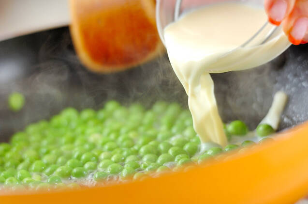 フライパンにバターを入れて火にかけ、グリンピースを凍ったまま入れて炒める。グリンピースに火が通ったら豆乳を加え、塩コショウを振る。