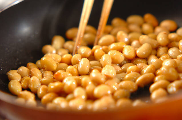 フライパンにサラダ油を熱し、水煮大豆を少し焼き色がつくまで炒める。