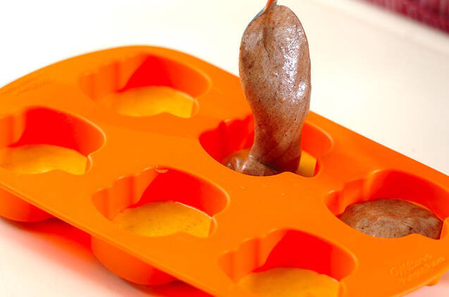耐熱のシリコン型にカボチャ生地を5分目まで入れ、その上にココア生地を9分目まで入れる。