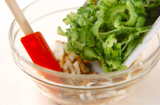 <合わせダレ>にしっかり水気をきったゴーヤとちくわを混ぜ合わせ、器に盛り分ける。