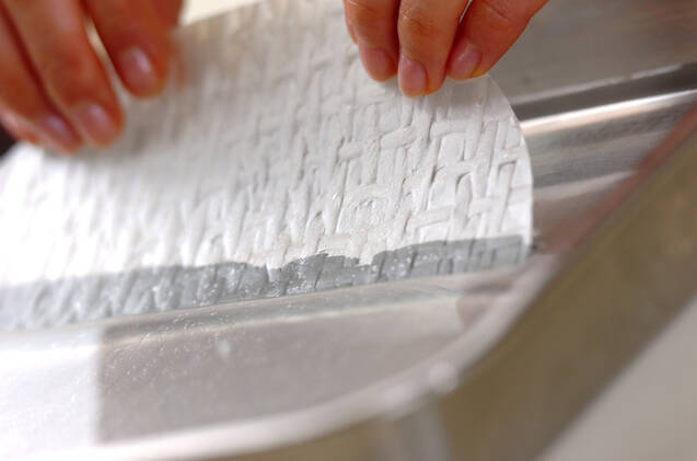 平らなところに固く絞ったキッチンペーパーを広げ、生春巻きの皮を水に通して広げて重ねる。同じことを繰り返し、4枚重ねる。生春巻きの皮が固い場合はぬるま湯に通して下さい。生春巻きの皮が薄い場合は、霧吹きで両面を軽くぬらして下さい。