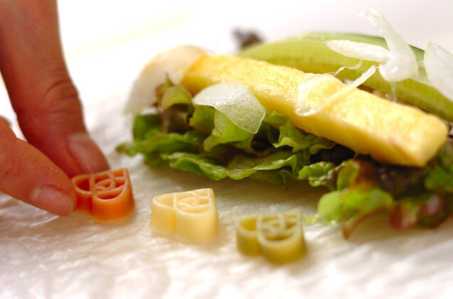 巻き終わる少し手前にマカロニをのせて、押さえながら崩れないように巻く。残りも同様に巻き、器に盛ってエディブルフラワーを飾り、混ぜ合わせた<ソース>を添える。