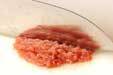 <梅ダレ>の梅干しは種を取って細かくたたき、ペースト状にして、他の材料と混ぜ合わせる。