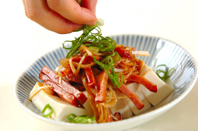 <タレ>のボウルに(1)、白ネギ、ショウガを入れて混ぜ合わせ、絹ごし豆腐を盛った器にのせ、刻みネギと白ゴマを散らす。