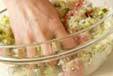 ボウルに豚ひき肉、エビ、キャベツ、ニラ、白ネギ、<合わせ調味料>の材料をよく混ぜ合わせる。