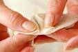 餃子の皮に1を大さじ1位のせ、皮のフチに水をグルッと薄く塗り、ひだを取りながら包む。