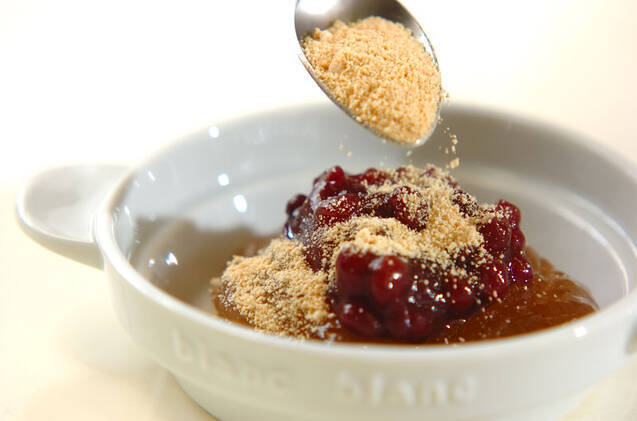 熱いうちに、水でぬらしたスプーンでひとくち大ずつすくい、冷水に落とす。冷めたらしっかり水気をきって、ゆで小豆と共に器に盛り、混ぜ合わせたきな粉をまぶす。