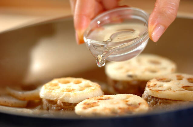 酒を加えてフライパンの蓋をし、弱火で中に火が通るまで蒸し焼きにする。