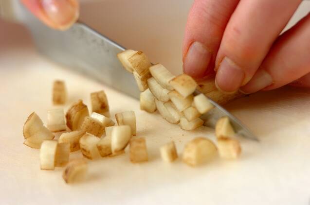 ゴボウはたわしできれいに水洗いし、粗みじん切りにする。