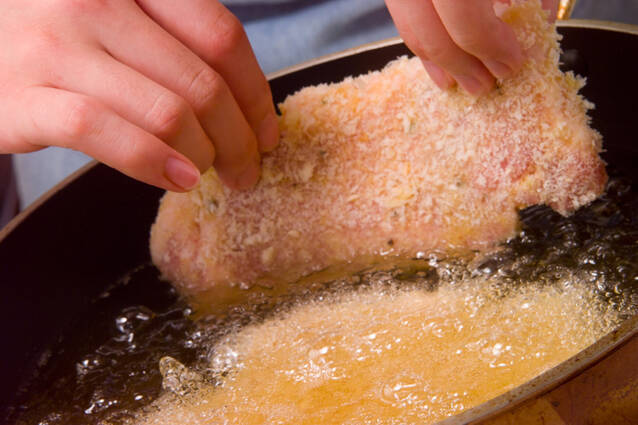 170℃の揚げ油に、衣をつけた豚肉を入れ、色よくしっかり揚げる。油をきって、食べやすい大きさに切る。