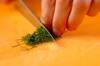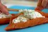 生鮭は皮側を残して厚みを半分に切り、切り開いたところに<チーズソース>をはさむ。