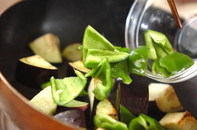 フライパンにサラダ油を中火で熱し、(1)のナスを炒める。火が通ったらピーマンを加えて炒め合わせ、<調味料>を加えて水分が少なくなるまで炒め合わせる。