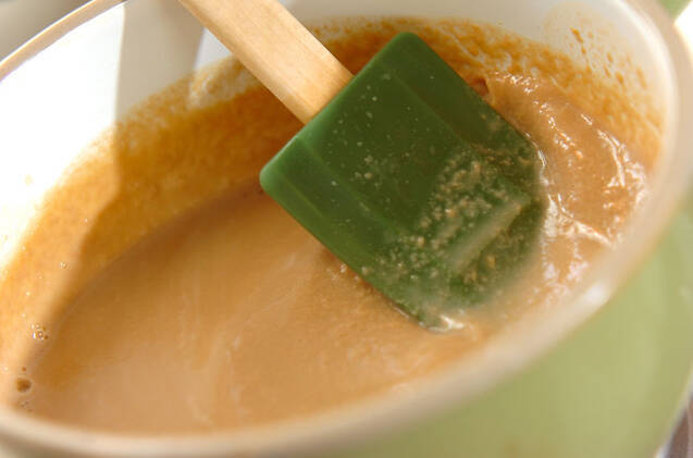 (2)に(1)を加えてよく混ぜ合わせ、鍋に戻し入れる。ゴムベラで混ぜながら、煮たてない様に気をつけ、トロミがつくまで火にかける。