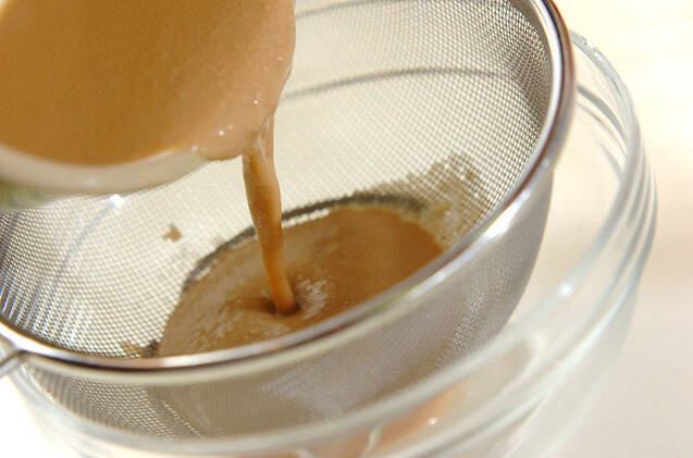 火を止め、ゼラチンを加えて完全に溶かし、網でこす。氷水に当てながらゴムベラで混ぜて粗熱を取り、ホワイトキュラソーを加える。