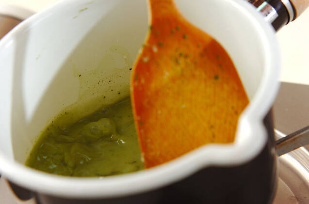 鍋に砂糖を入れ、水と合わせた葛粉を加えてよく混ぜ合わせる。強火にかけ、木ベラで混ぜながら2分火を入れる。