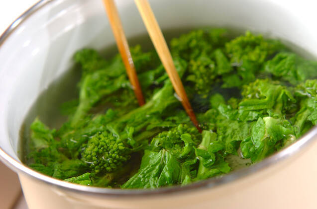 菜の花は塩少々を入れた熱湯でサッとゆで、水に取り水気を絞って3cmの長さに切る。