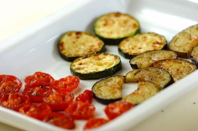 <夏野菜>のナス、ズッキーニ、プチトマトは幅7~8mmに切り、塩コショウを振ってオリーブ油で両面焼いておく。